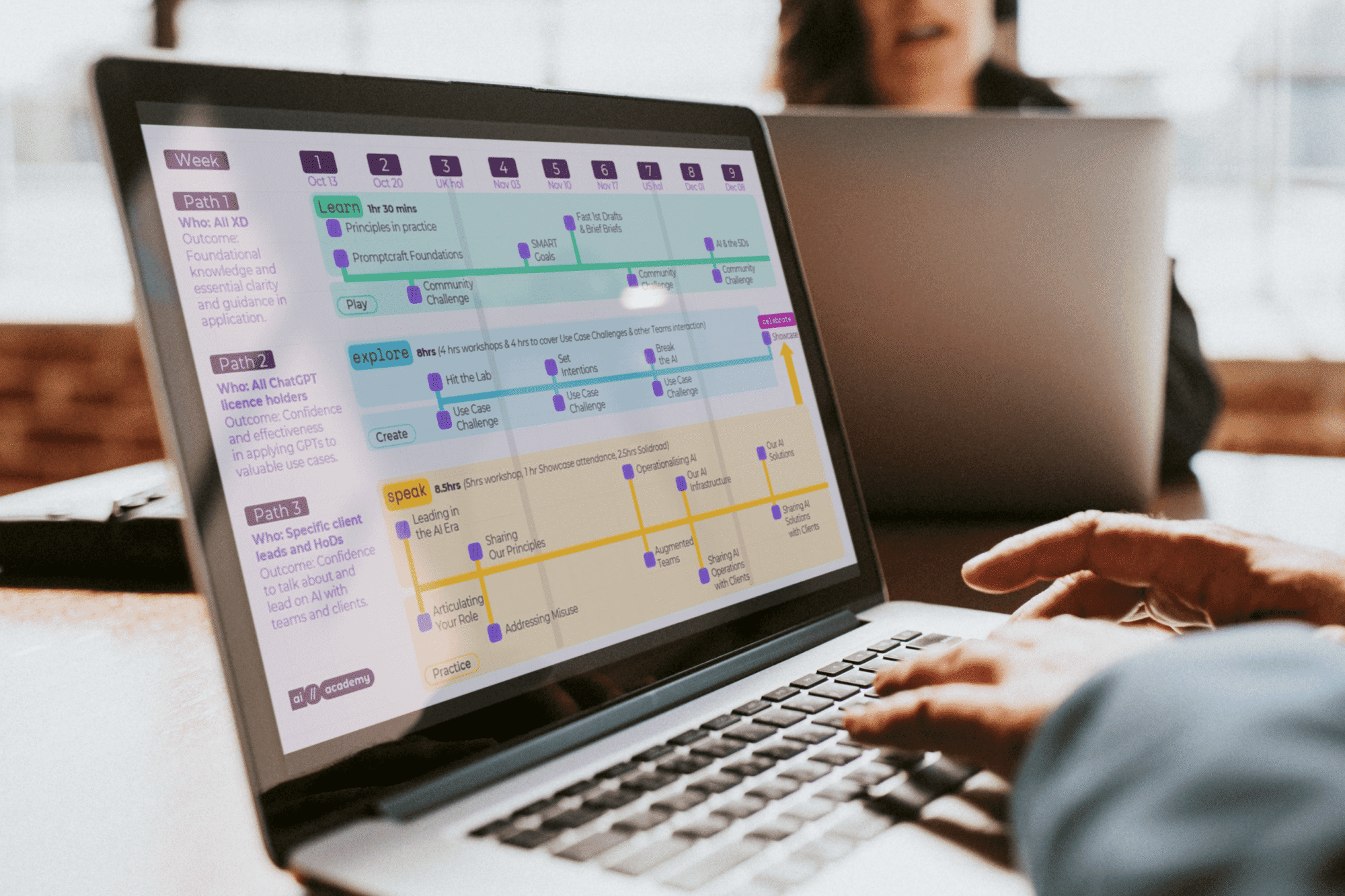 We designed a virtual institution, the AI Academy – a nine-week experience designed to move people from awareness to confident application.